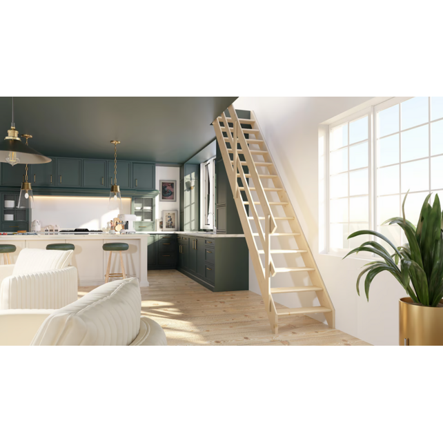 De Cottage MEDIUM 70 cm mezzanine trap is vervaardigd uit onbehandeld vurenhout. Deze rechte steektrappen zijn veelzijdig inzetbaar, ideaal voor bijvoorbeeld hoogslapers, vides, en zolders, en zijn eenvoudig zelf te monteren dankzij de meegeleverde montagehandleiding.